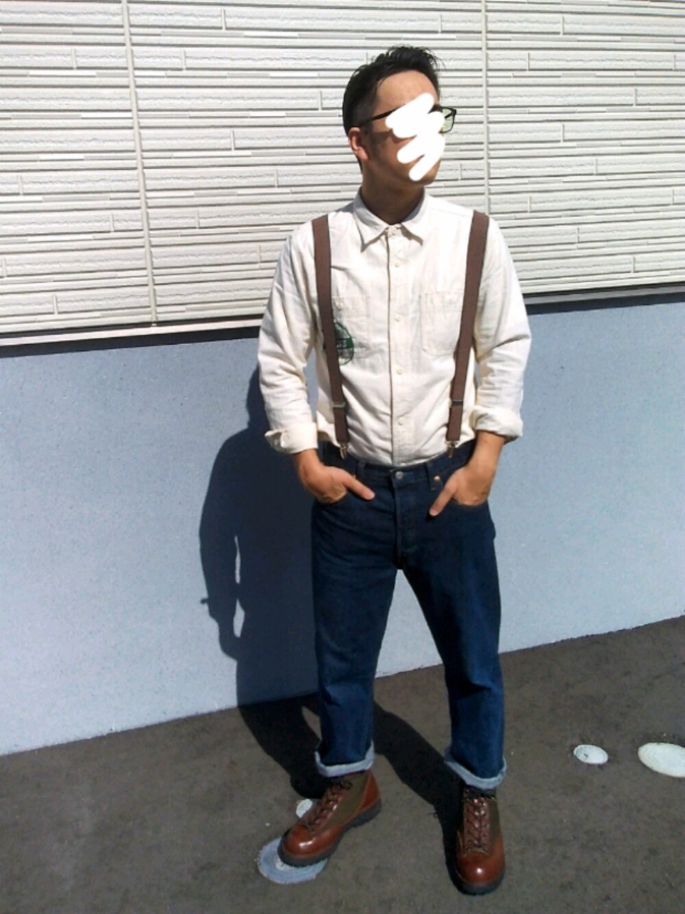 サスペンダーを使ってのワーカースタイルです Ben davis ワークシャツ Levi's 501 Danner Light