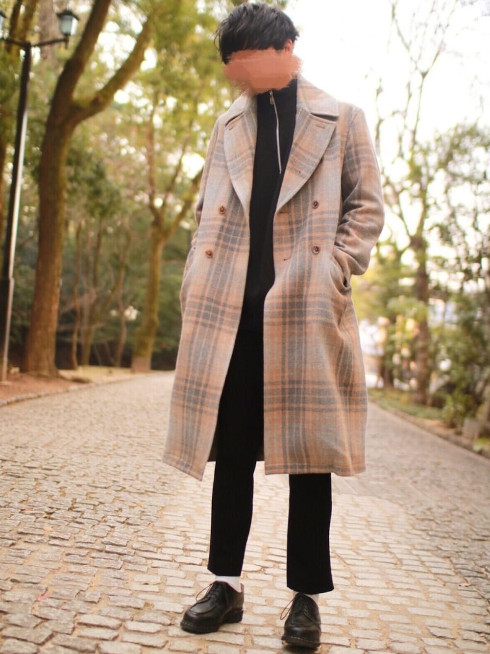 にっしーのチェスターコート「ウールツィードBIGチェックコート」を使ったコーディネート
