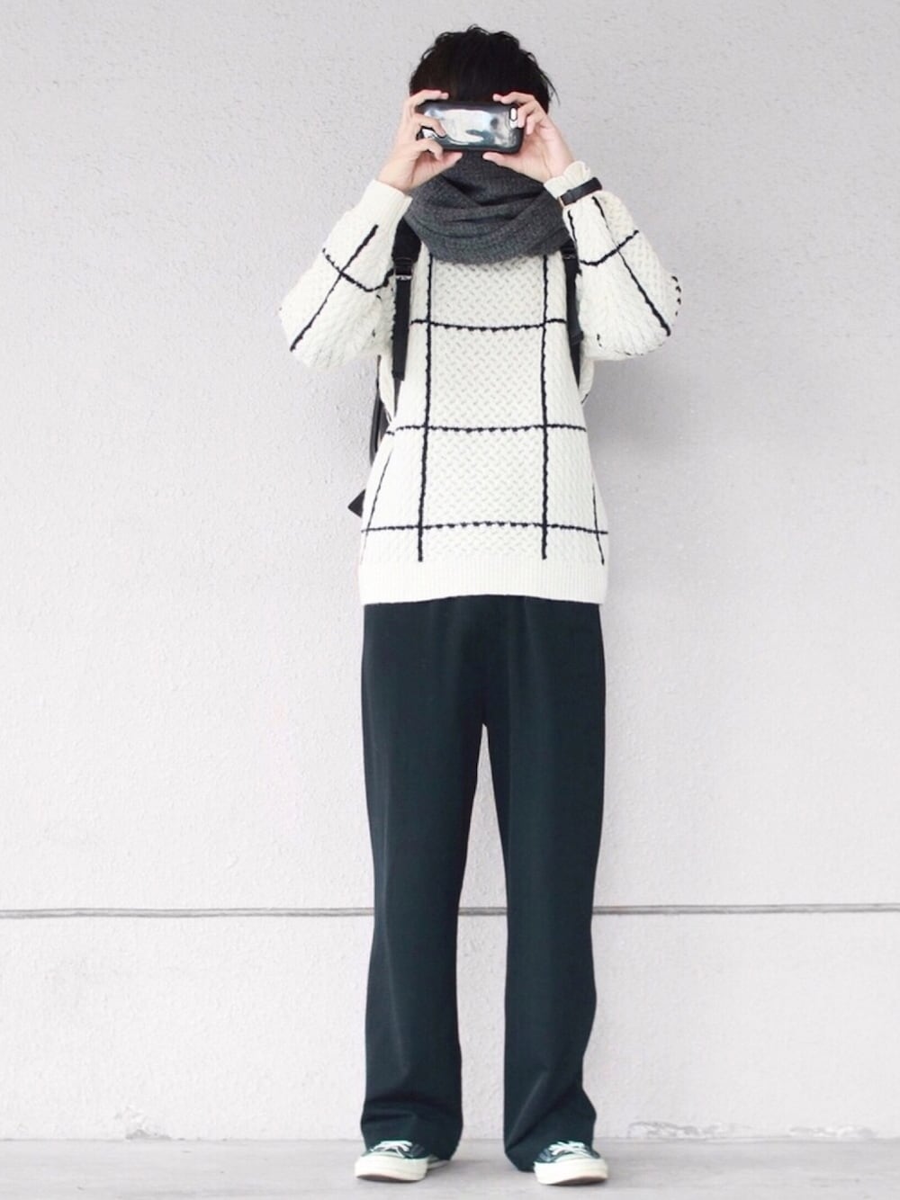 にっしーのニット/セーター「ウインドペンチェックモックネックニット」を使ったコーディネート