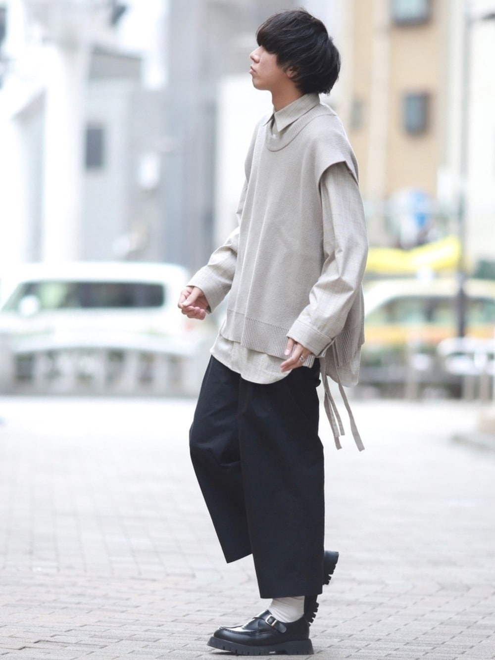 にっしーのベスト「Multiway OVERSIZED KNIT VEST / マルチウェイオーバーサイズニットベスト」を使ったコーディネート