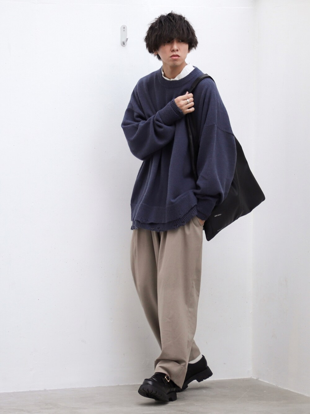 にっしーのニット/セーター「OVERSIZED LAYERED DAMEGE KNIT / オーバーサイズレイヤードダメージニット」を使ったコーディネート