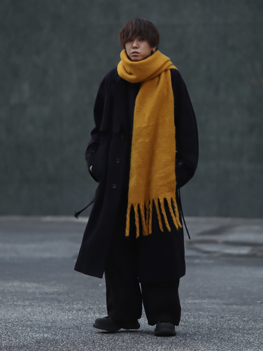 ダークトーンのスタイルに イエローのマフラーがアクセントに!