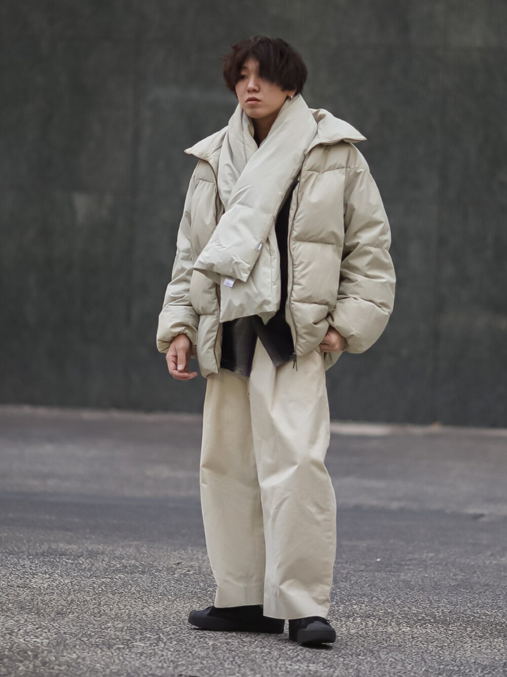 ホワイトのダウンと ホワイトパンツでワントーンコーデ! ダウンと同窓会のダウンマフラーも アクセントに