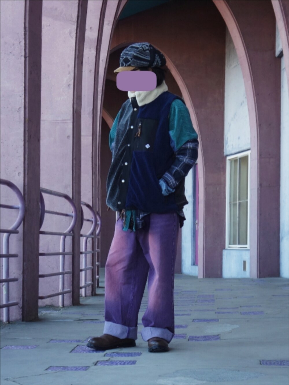 パープルカラーのワイドデニムパンツが手持ちのエスニック系アイテムと相性が良さそうだったので組み合わせてみました。