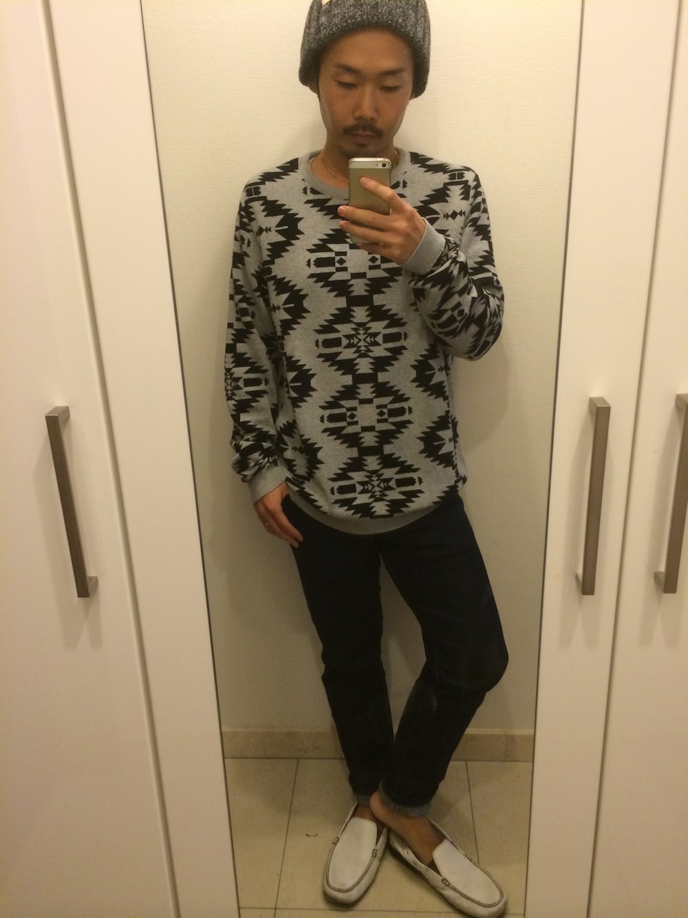 グレー系のニット/セーターを着用したメンズの秋コーディネートの1枚目の写真