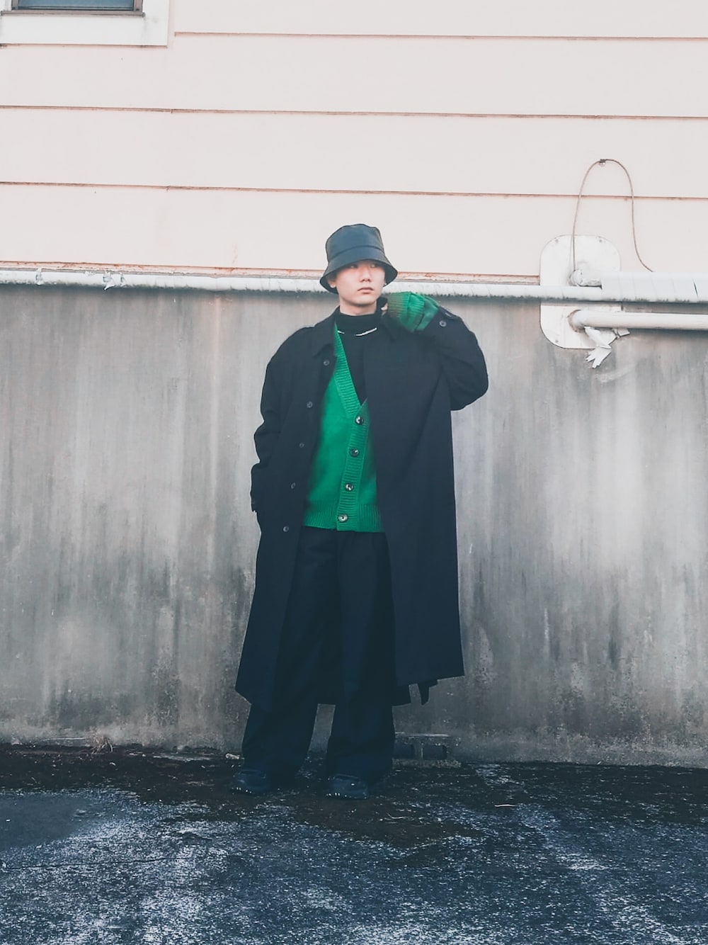 初投稿 基本的にモノトーン この日はグリーンのカーディガンでアクセント