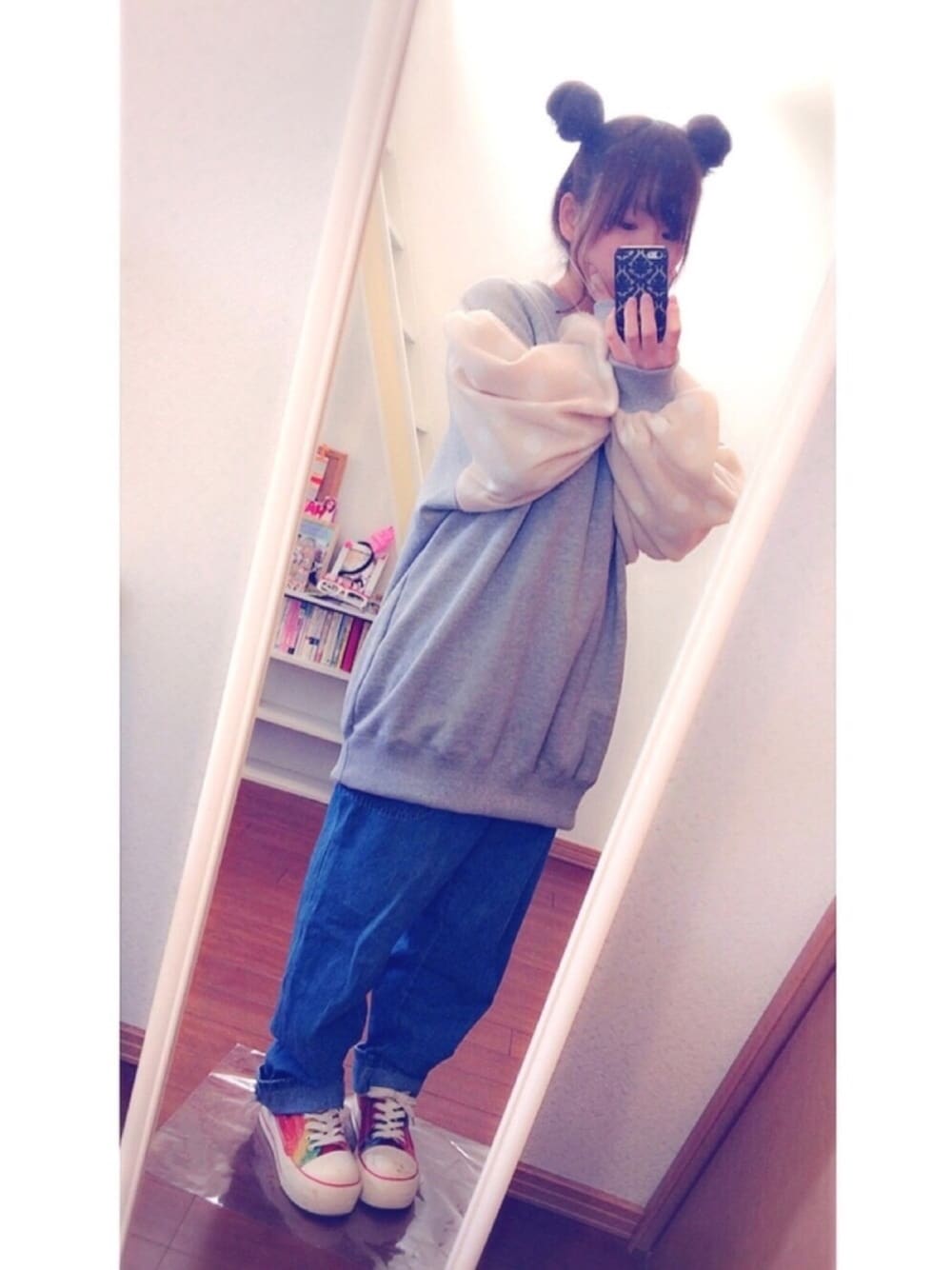 0264でであったスウェットかわいすぎて 一目惚れしたけどやっぱお店出てやっぱ欲しくて戻って買っちゃった 切り替えかわいい ○0264 sweat ○SPINNS easypants ○なんでもアリーマーケット sneaker