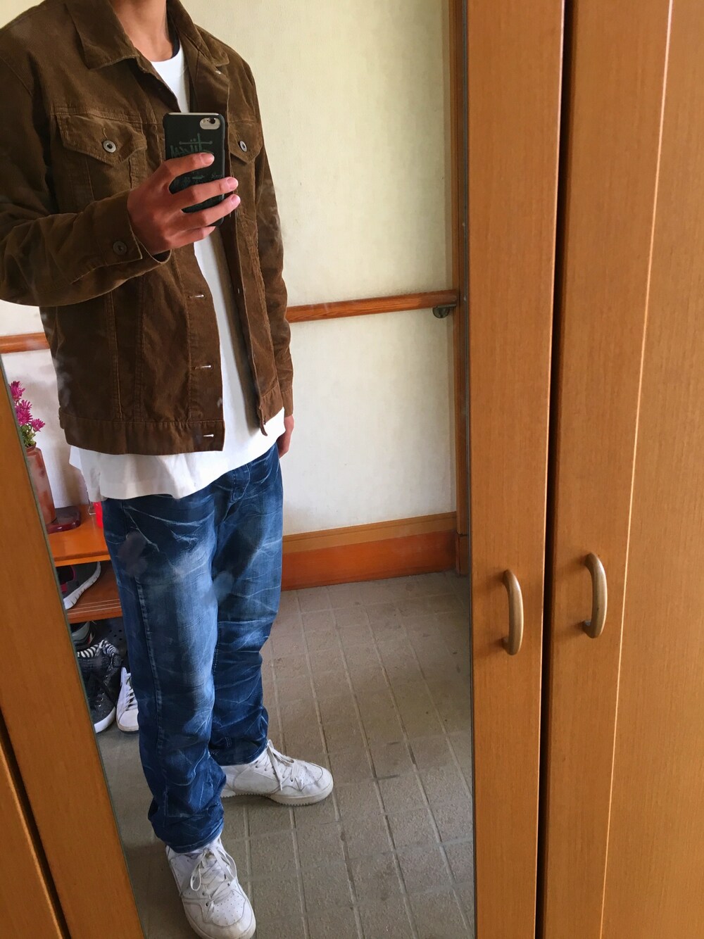 ブラウン系のジャケット/アウター、ホワイト系のTシャツ/カットソー、ブルー系のデニムパンツを着用したメンズの冬コーディネートの1枚目の写真