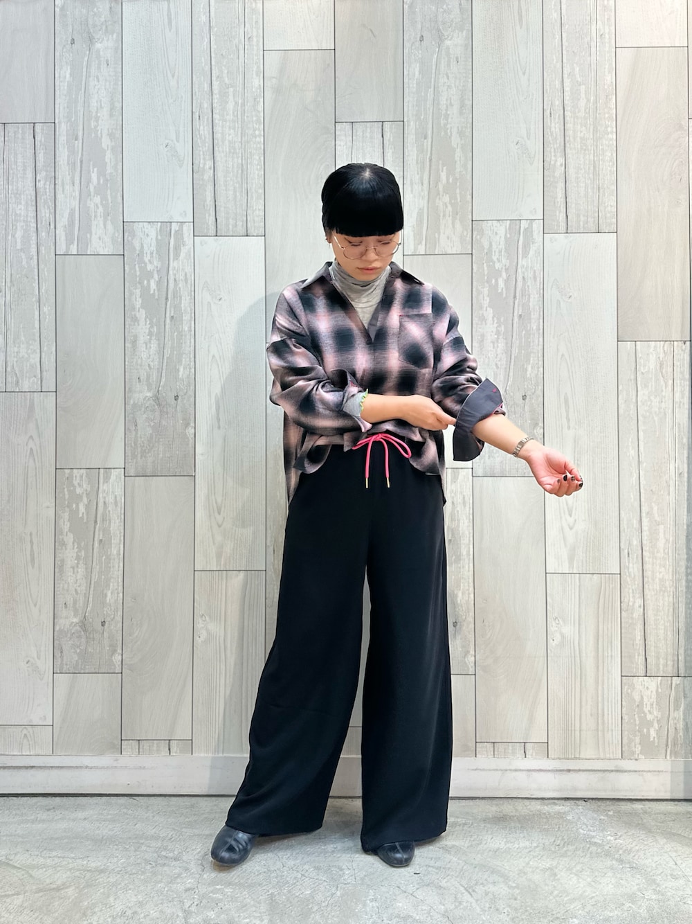ネオンカラーのチェックシャツにリラックス感のあるワイドパンツでデイリーコーデに。