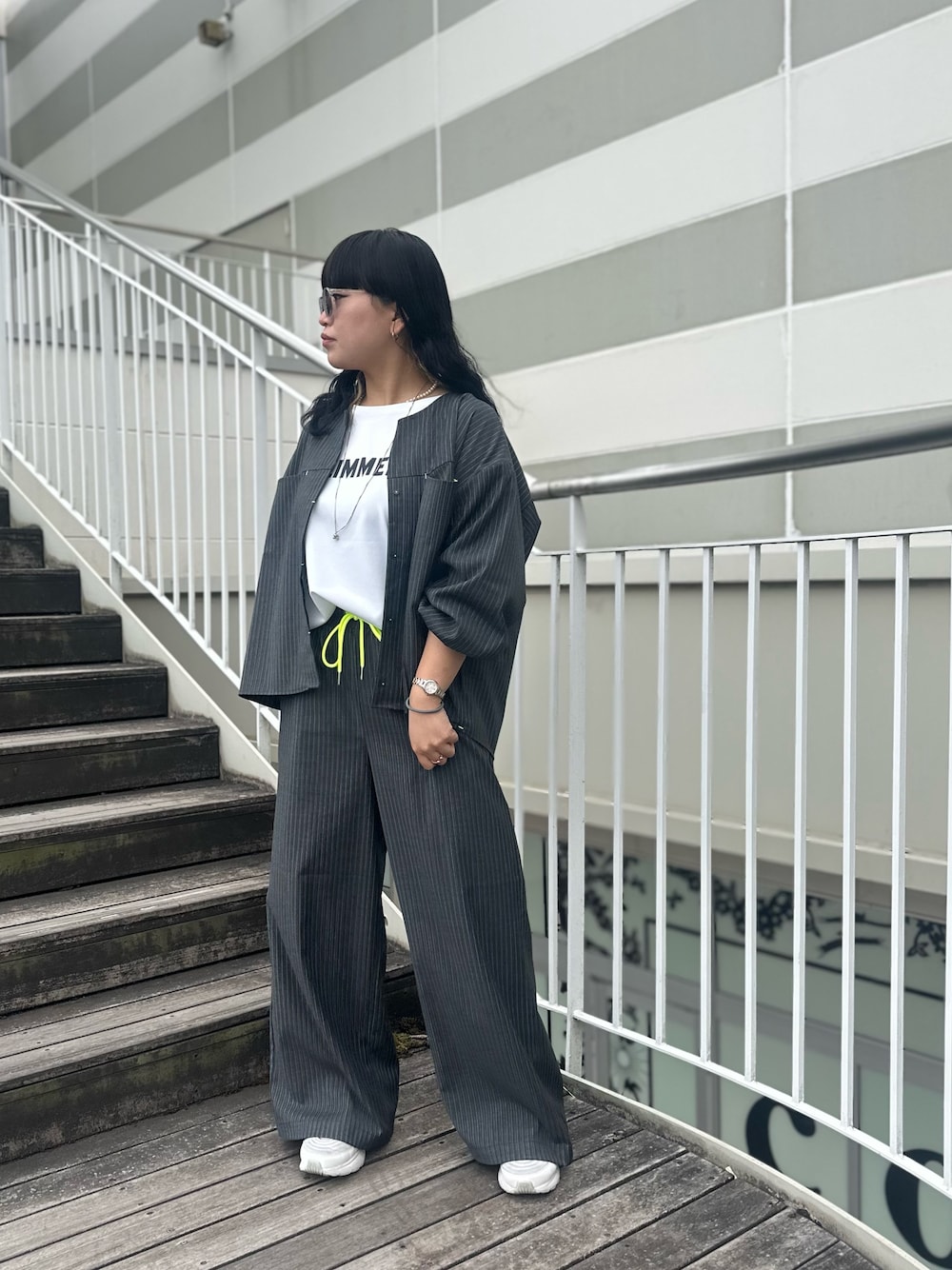 AYANE(www.Q shop.jp Qひたちなかファッションクルーズ店)のその他パンツ「ストライプウエストギャザーワイドパンツ」を使ったコーディネート
