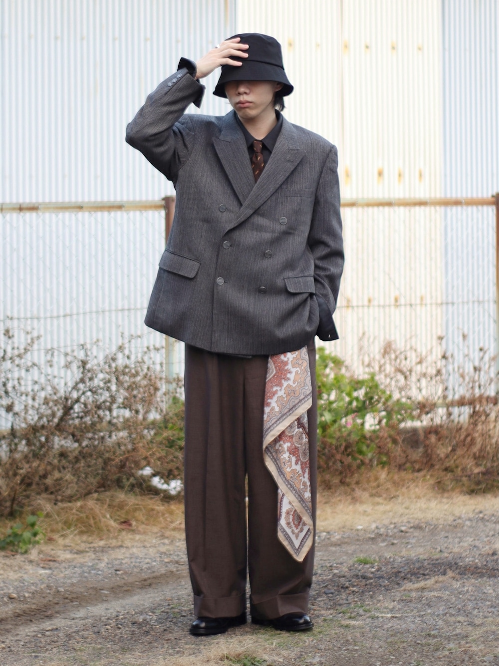 クリスマス終わったので、自分全開コーデでいきます🤟 全体的にキレイめですが、ワイドパンツ、スカーフ、バケハで中和✨