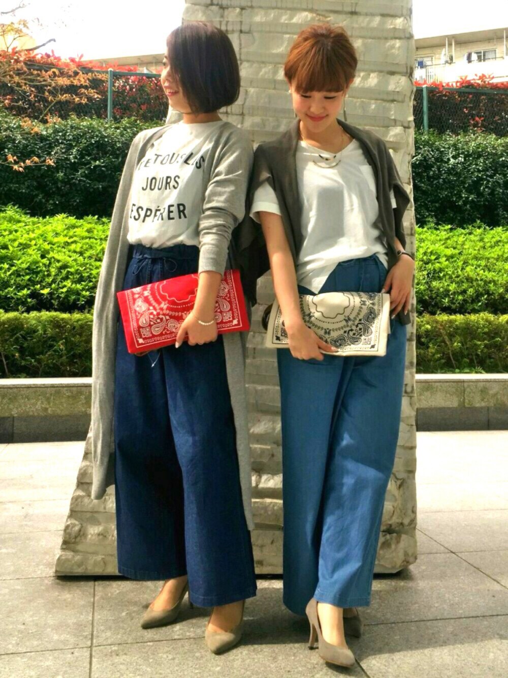 双子コーデ♡ 夏日だったこの日は 2人でTシャツ❌ワイドデニム 丈の違うカーデ合わせだけど どちらも合いますね♡ バックはトートにもクラッチにもなる優れもの♪ いつも見ていただきましてありがとうございます♡「いいね・セーブ・コメント」嬉しいです。ありがとうございます♡