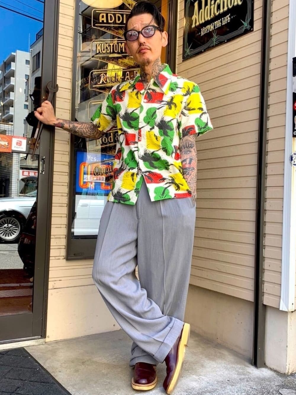 ARTtraction S/S PALM S.SUCKER SHIRT パーム シアサッカーシャツ にヴィンテージ スラックスで大人な涼しげな50s style^_^ Addiction Store 店頭営業時間12時〜20時 神奈川県横浜市南区万世町1-1 Web Store : https://www.addiction-ktl.net/ TEL&FAX 045-315-3034 Addiction - Kustom The Life Website : http://addiction-ktl.jp/ Diary : https://addiction-ktl.blogspot.jp Shop インスタ@addictionstore1951 個人 インスタ @addictionkustomtheliferyuta