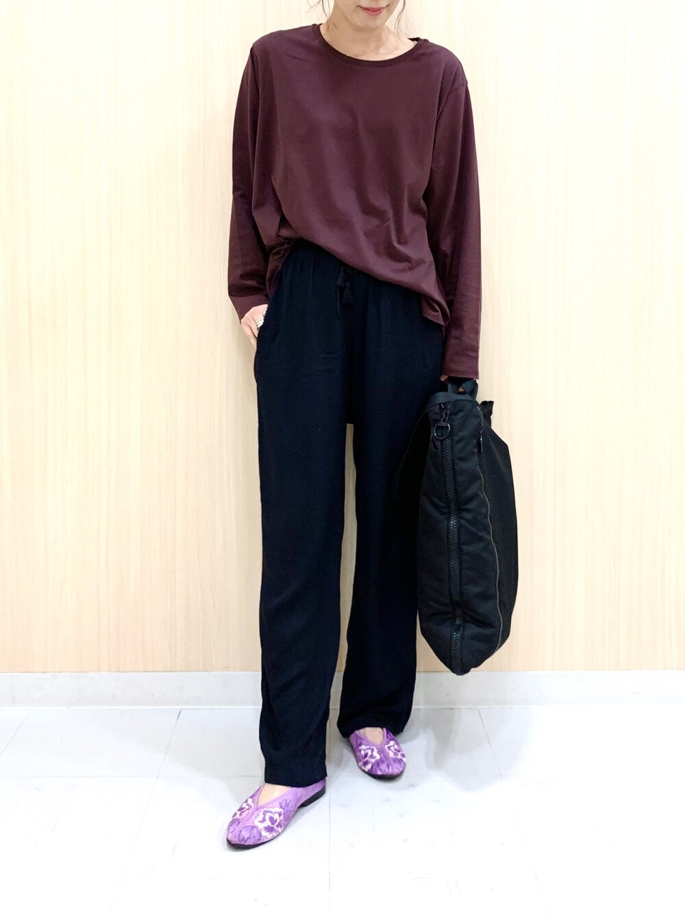 オールUNIQLO! コットンロングシャツテールt とサテンワイドストレートパンツでリラックススタイル♡