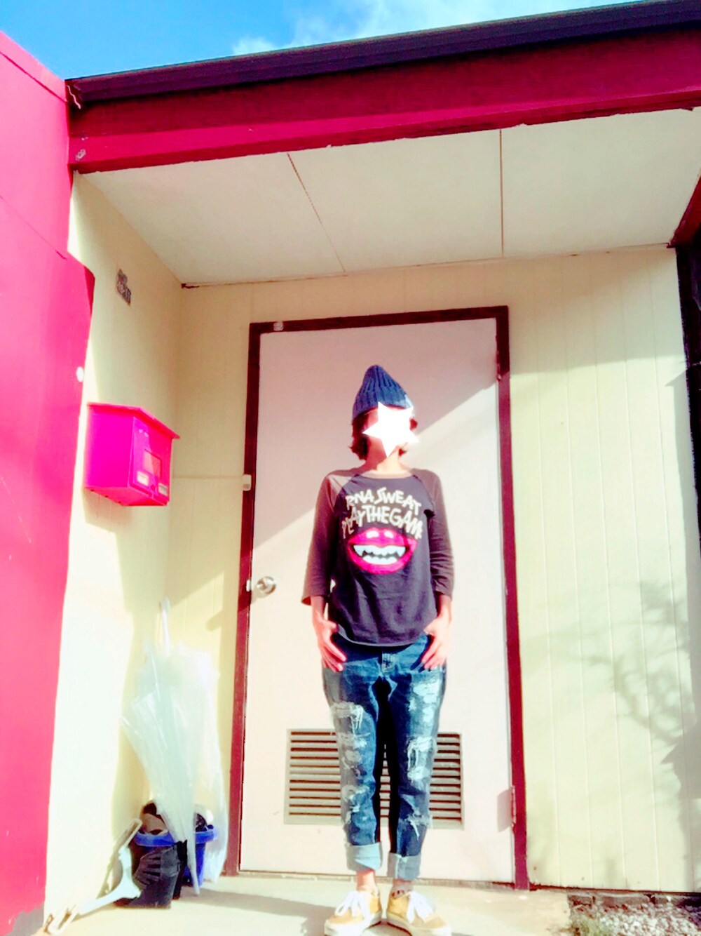コンビニまで ジーンズは去年一目惚れで買った。 内もも側が素材違い色違いでリメイクされてる。