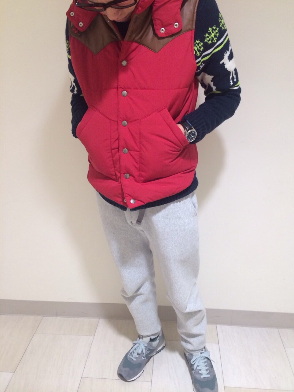 今日のコーデ outer:BEAMS knit:H&M shirt:H&M pants:CHAMPION shoes:NEWBALANCE accessory:BEAMS