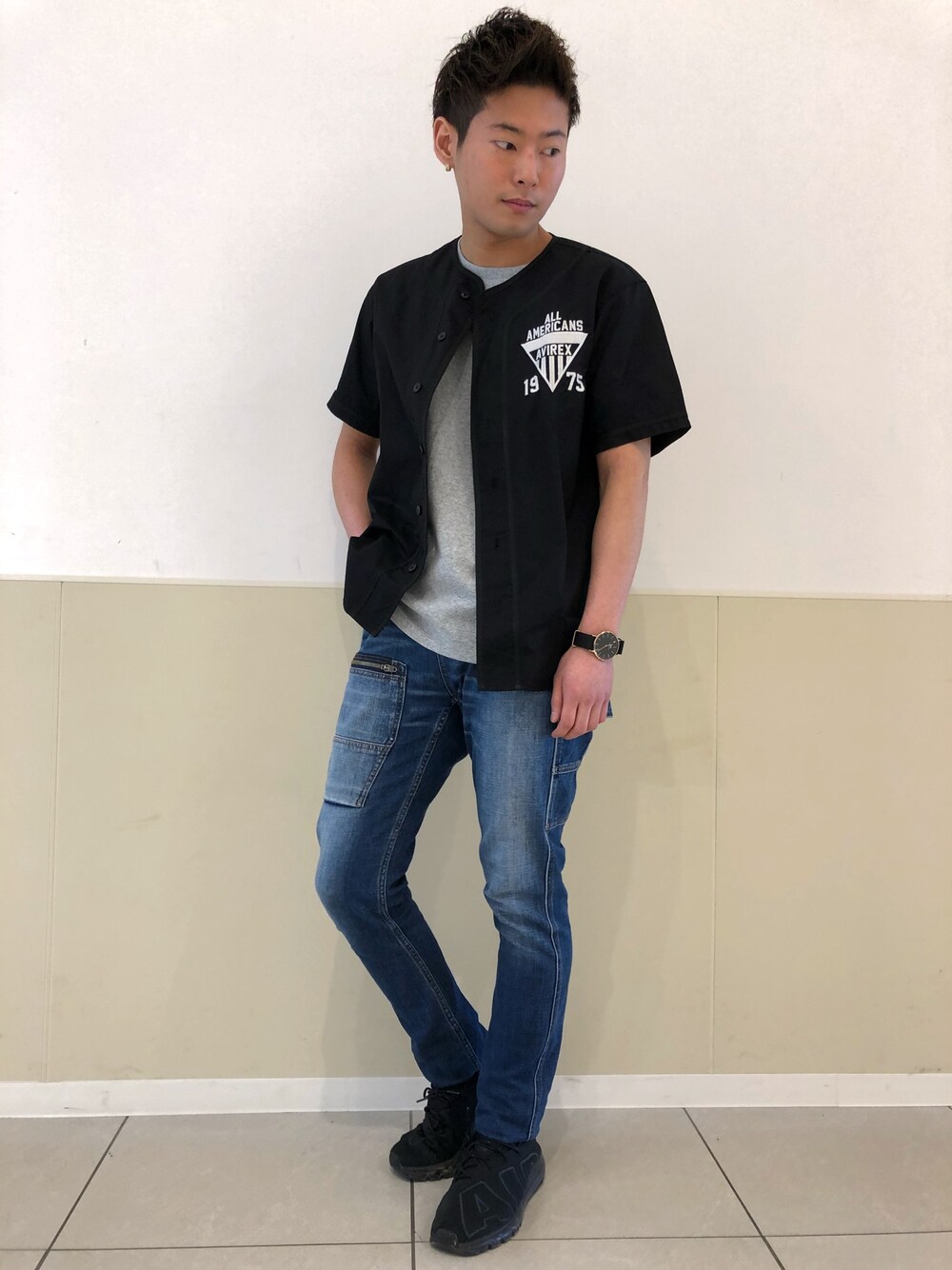 大山凌のシャツ/ブラウス「AVIREX/アヴィレックス/ 半袖 クールマックス ストレッチ ベースボールシャツ/ S/S COOLMAX STRETCH BASEBALL SHIRT」を使ったコーディネート