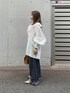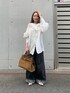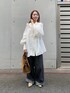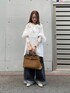 別注のcrinkle crinkle crinkleのブラウスでキレイめにも使えるけど、デニムでカジュアルさをプラスしたコーデを組んでみました! トップスのブラウスはフリルがとっても可愛いです✨袖もボリューム感のあるふんわり柔らかな印象を与えてくれるデザインになっております!低身長には着丈が長めですが、出してきても着られてる感なく合わせることができますよ!カチッとスラックスと合わせたりする時はインしてすっきりと見せた方が良いと思います! パンツはリアルバイしたデニムパンツです!ウエストにゴム紐がついており楽ちんで、ゆったりと履けるワイドな形です!✨私はロールアップして裾を折ってますが、折っても可愛いので低身長さんにオススメなアイテムですよ!