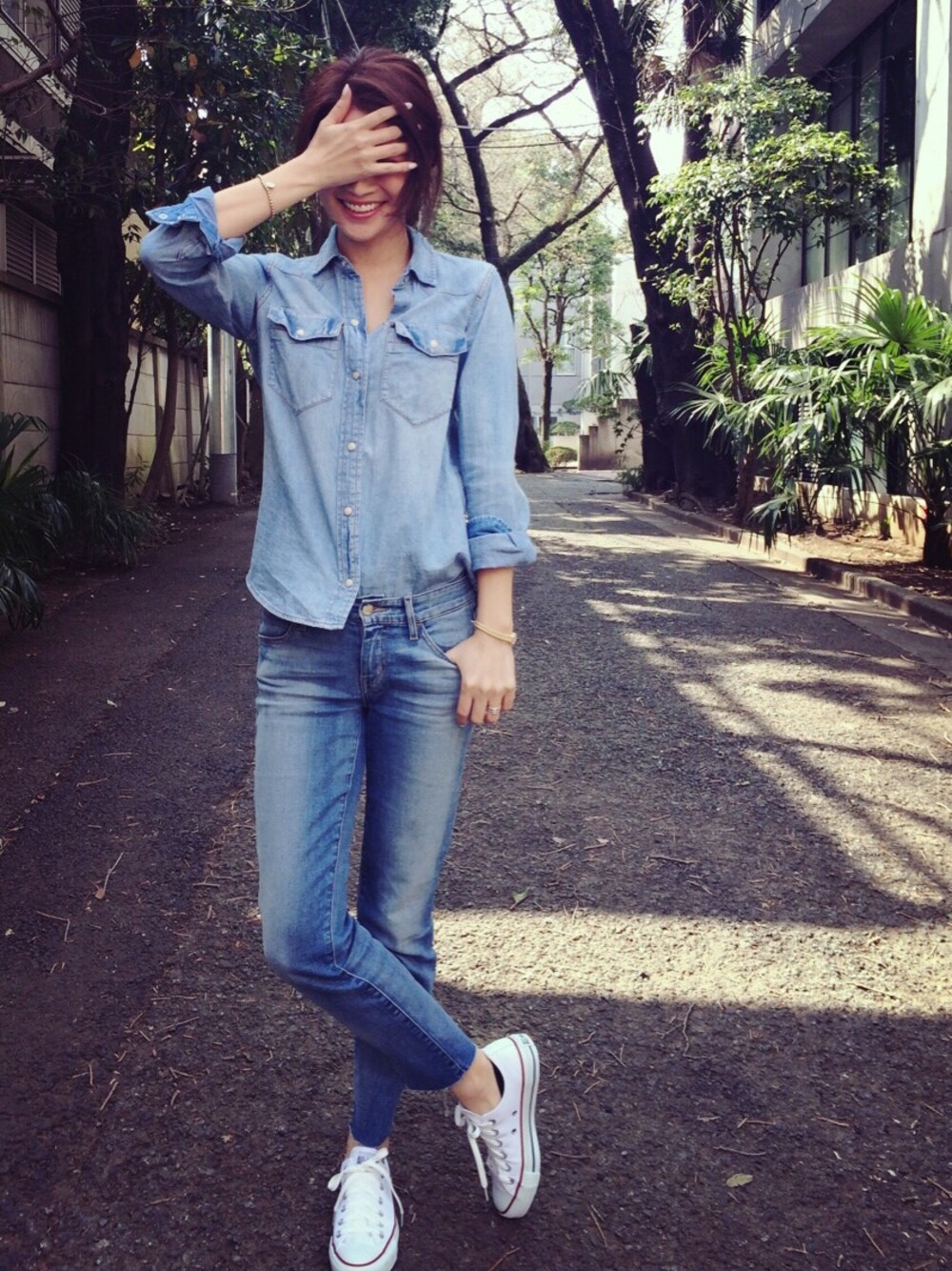 KORALのデニムは自分で裾をカット♪ デニムオンデニムは真っ白なCONVERSEで爽やかに。