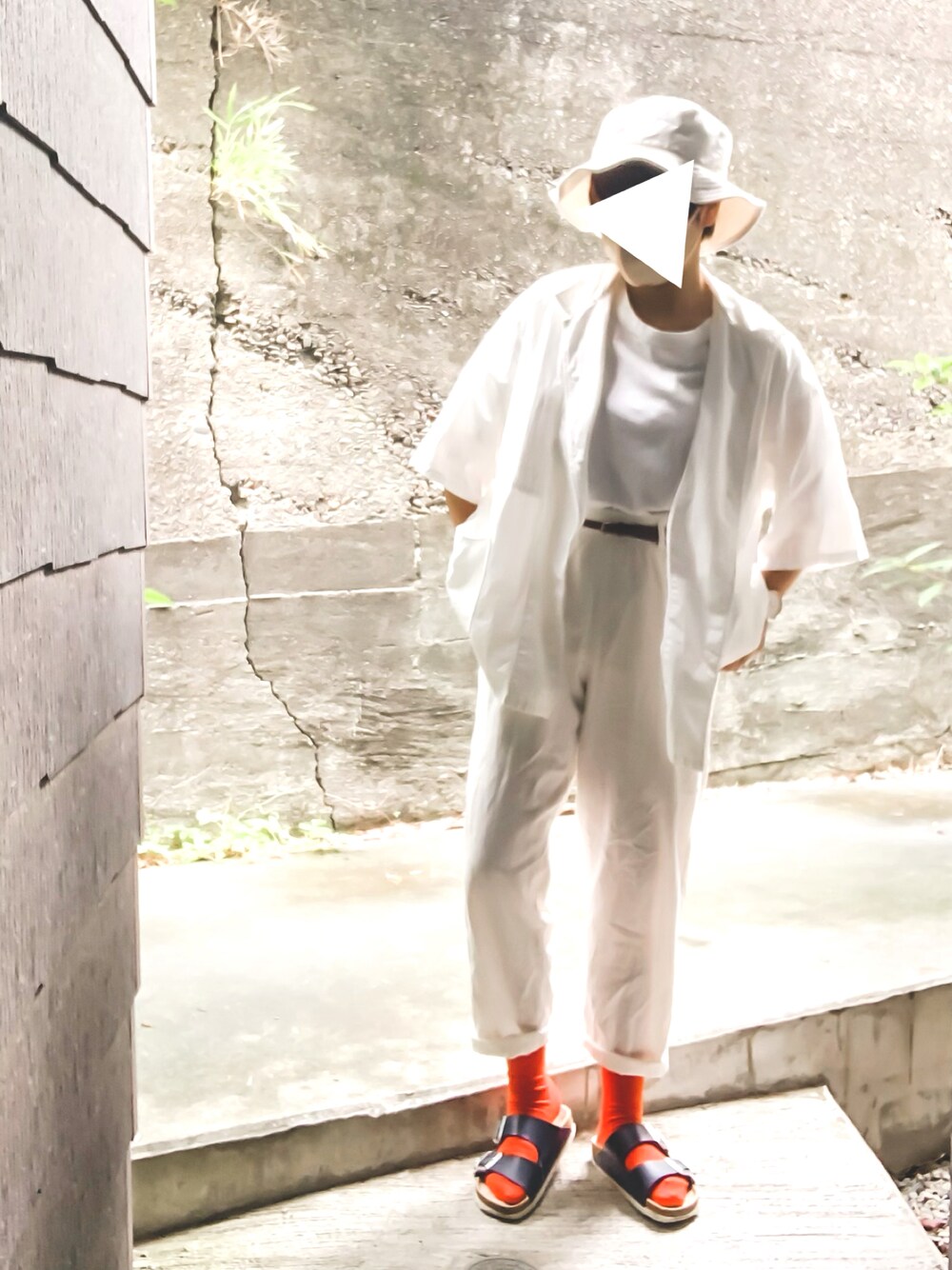 ☀️ ☞ ワントーンコーデ オレンジソックスが映える白コーデ🍊 _______________________________________ 〻color : 🤍🧡〻 👒 バケットハット 👔 Tシャツ × シャツ 👖 イージーパンツ 👟 靴下×サンダル _______________________________________