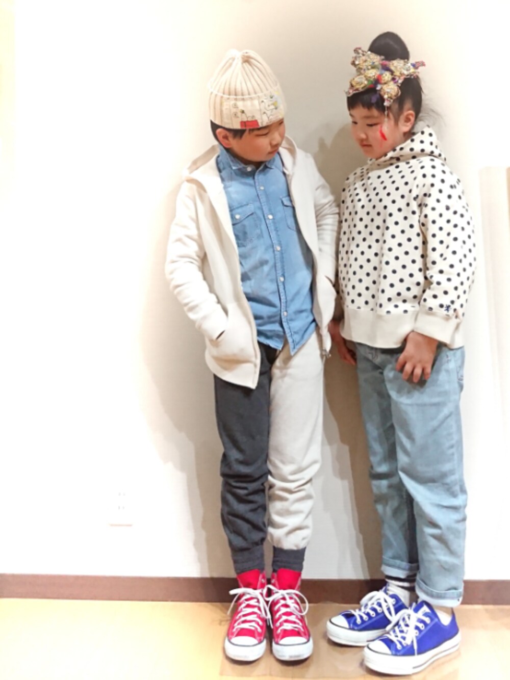 急に暑いくらいの陽気になって、春物の出番がないなぁと思っていたら、今日は少し肌寒いので、出番きたーー😆 二人で、トリコロールカラーコーデ💕 見ていただけて嬉しいですっ😊💕