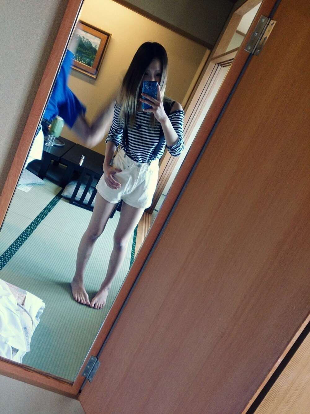 今流行りの肩だしトップスに ハイウエストのショーパンに サスペンダーにしてみました♡