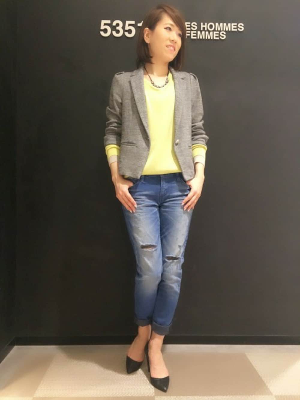 秋お勧めのジャケット、インナーにイエローを差し色にコーデ。