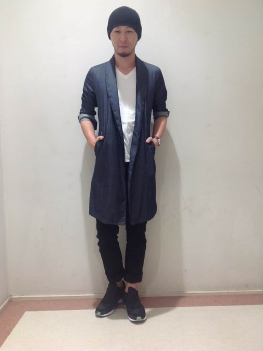 生地の薄いデニム素材のガウンシャツをシンプルなモノトーンで合わせました。 足元はデザインスニーカーであそびを入れています。