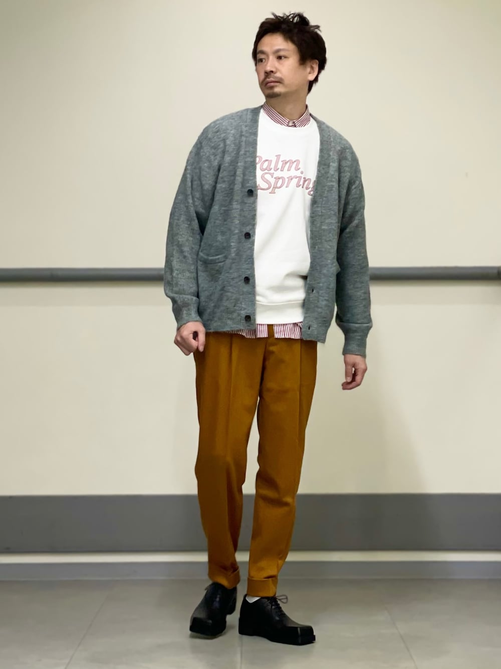 アルパカ混のシャギーカーディガンにシャツ×スウェットのカジュアルコーデ。 ふわふわを楽しめます😁