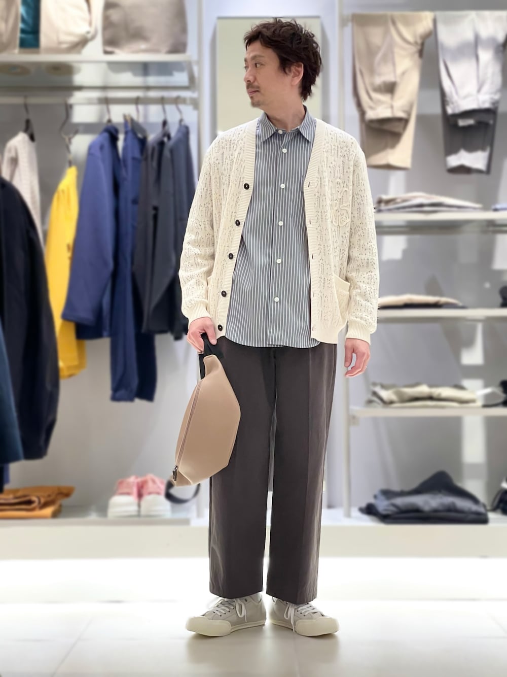 【ABAHOUSE新作を使ったコーディネート】 ▽基本情報 身長180 上46or48下46を主に着用 足細 手長 足42or43 ▽スタイリングポイント アバハウスの新作を使った春カジュアルをきれい目イメージで。 【クリア ストライプ レギュラーカラーシャツ】 ▽着用サイズ 46 ▽サイズ感 ちょいゆるを表現しているアイテム。 ▽着心地 さらっとした生地感が◎ ▽コメント アバハウスが強い中間色をきれいに表現しつつ、トレンド感のある形にしています。 【シボレザーショルダーバッグ】 ▽コメント 春夏の定番。手ぶらよりも1アクセントにもつかえるのでおすすめです。 カラーバリーエーションも豊富です。