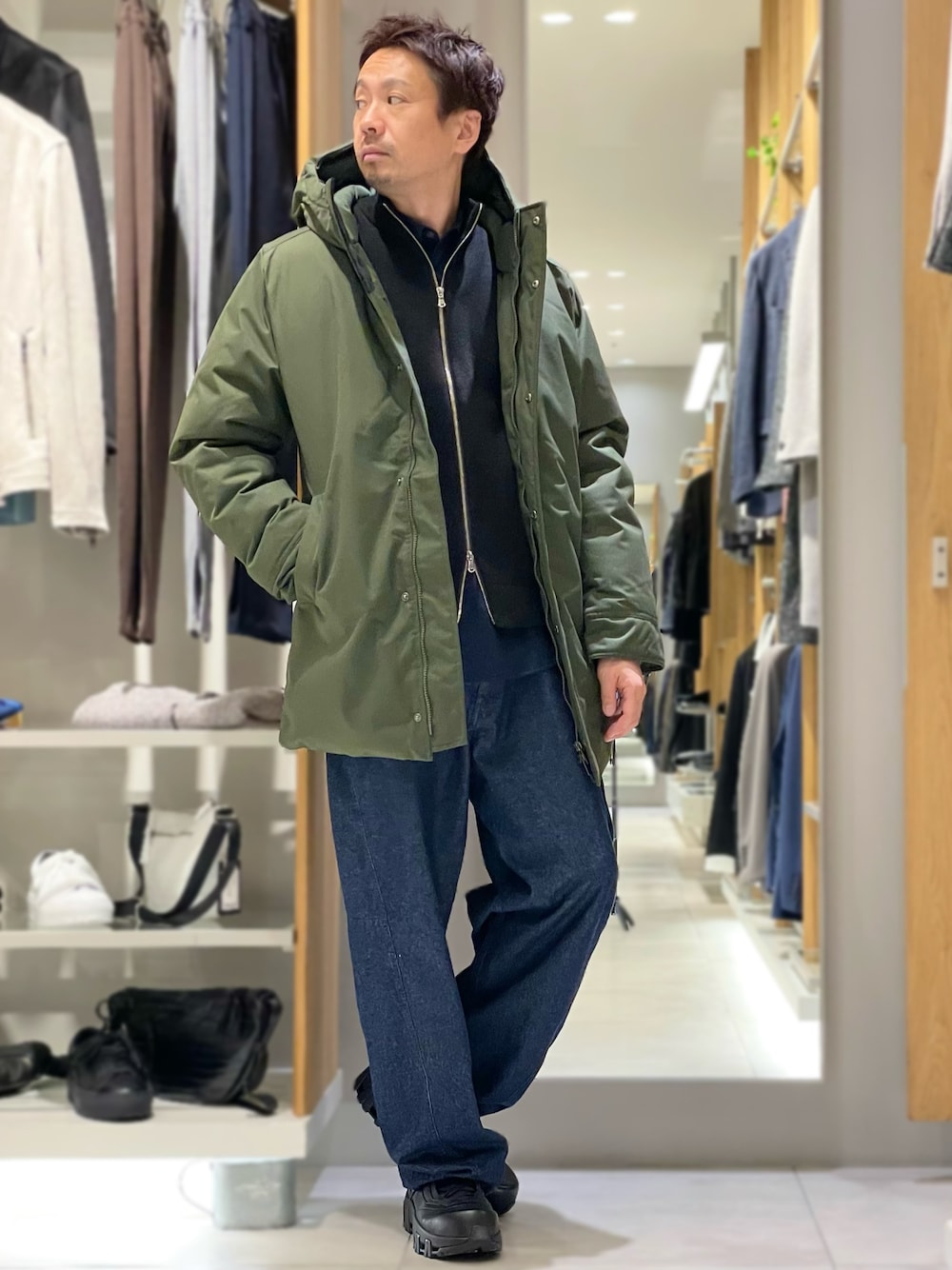 PYRENEX PAUをベースにナチュラルカジュアル。 ワイドデニムとジップベストでカジュアルな休日の装いをイメージ。 ダウン サイズ M デザイン 短すぎない着丈がポイント。 決して大き過ぎず、ナチュラルなゆるめコーデに最適なデザインです。