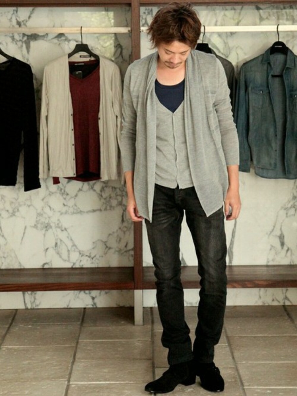 レイヤードベストスタイルになっているカーディガン。 ボトムは黒ですっきりみせるのがお勧めです。