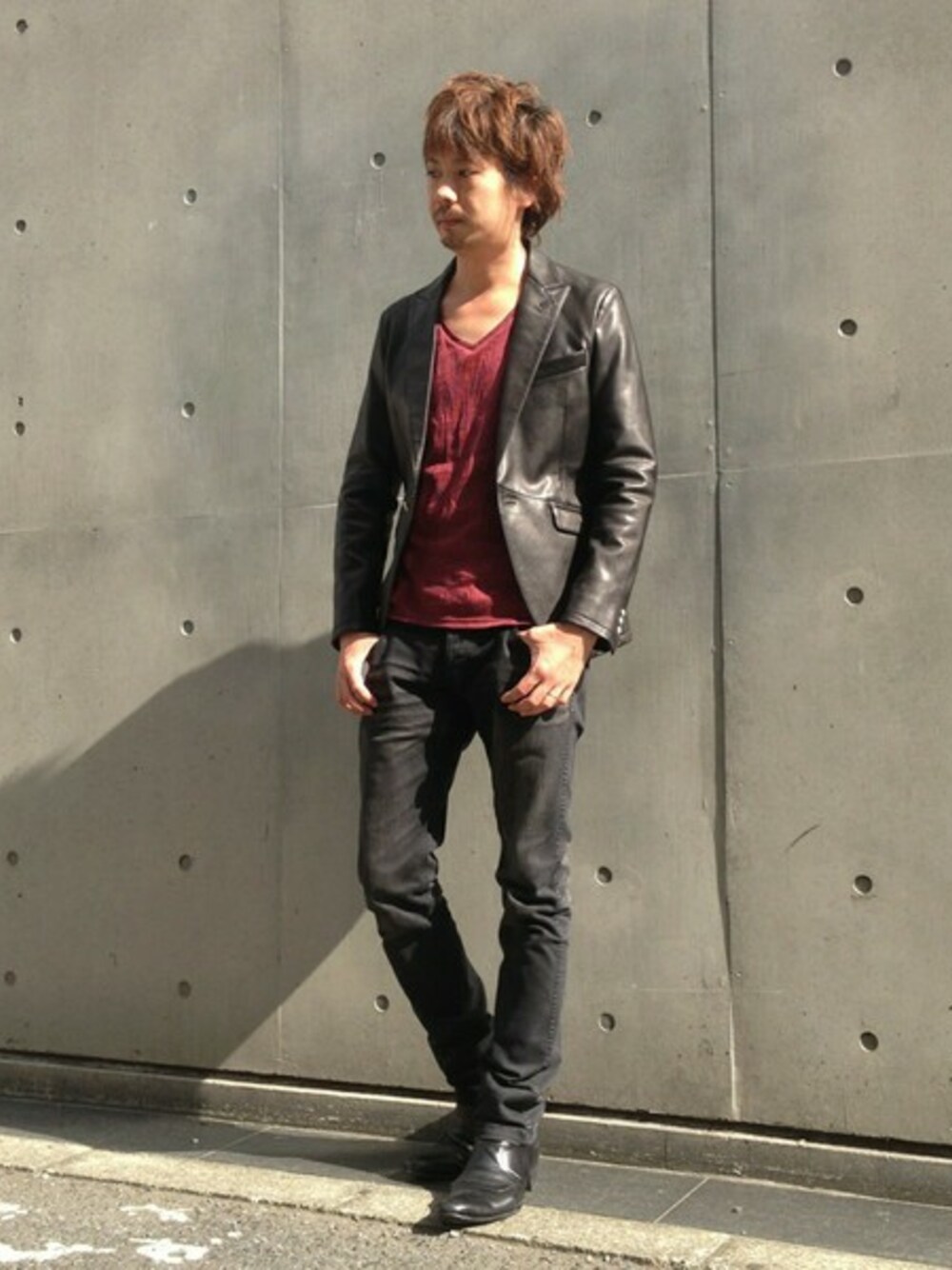 ゴートレザージャケットに細身のパンツをコーディネートしています。 今シーズンのおすすめはバーガンディーや赤といった差し色の着用です。