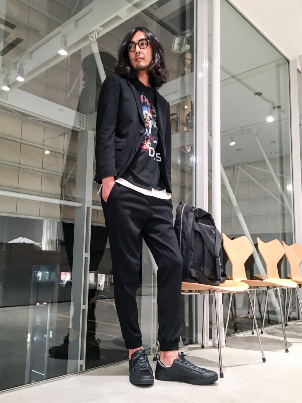 メッシュ素材のセットアップに古着をリメイクした1点物のロックTを合わせました。さり気なくパイソンレザースニーカーです。