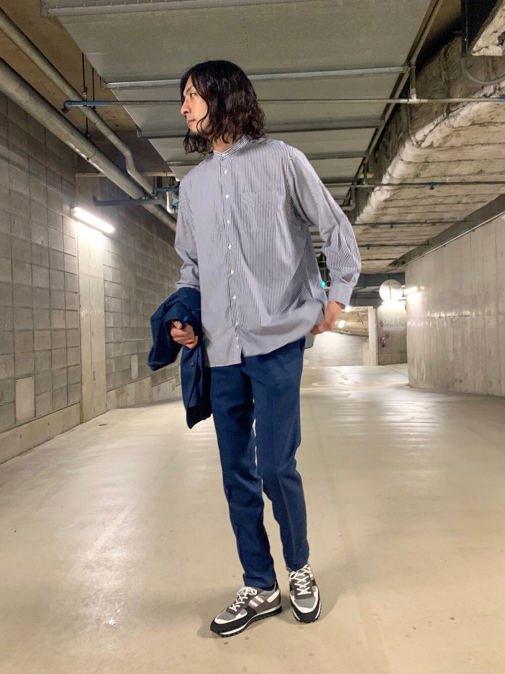 麻調のパリネ生地を使用したセットアップは、通気性、吸湿速乾性に優れ、さらにウォッシャブルと夏に適したアイテム。 トップスに合わせたオーバーサイズシャツは、Individualized shirtsの別注バンドカラーシャツです。