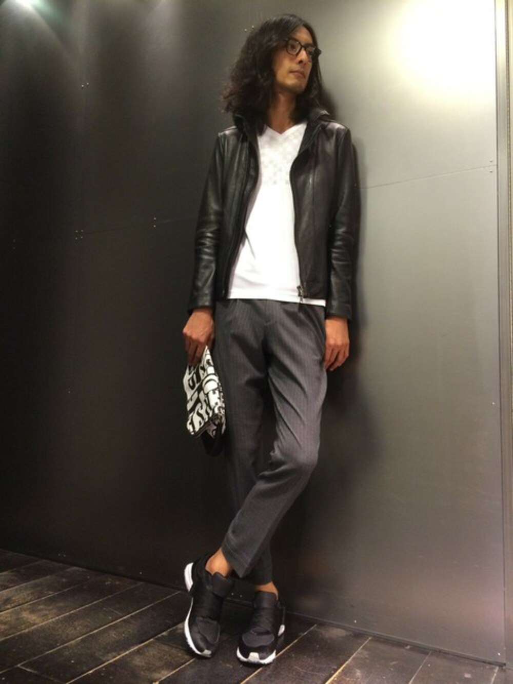 レザーライダースとストライプスラックスのコーディネート。全体的にモノトーンにまとめました。