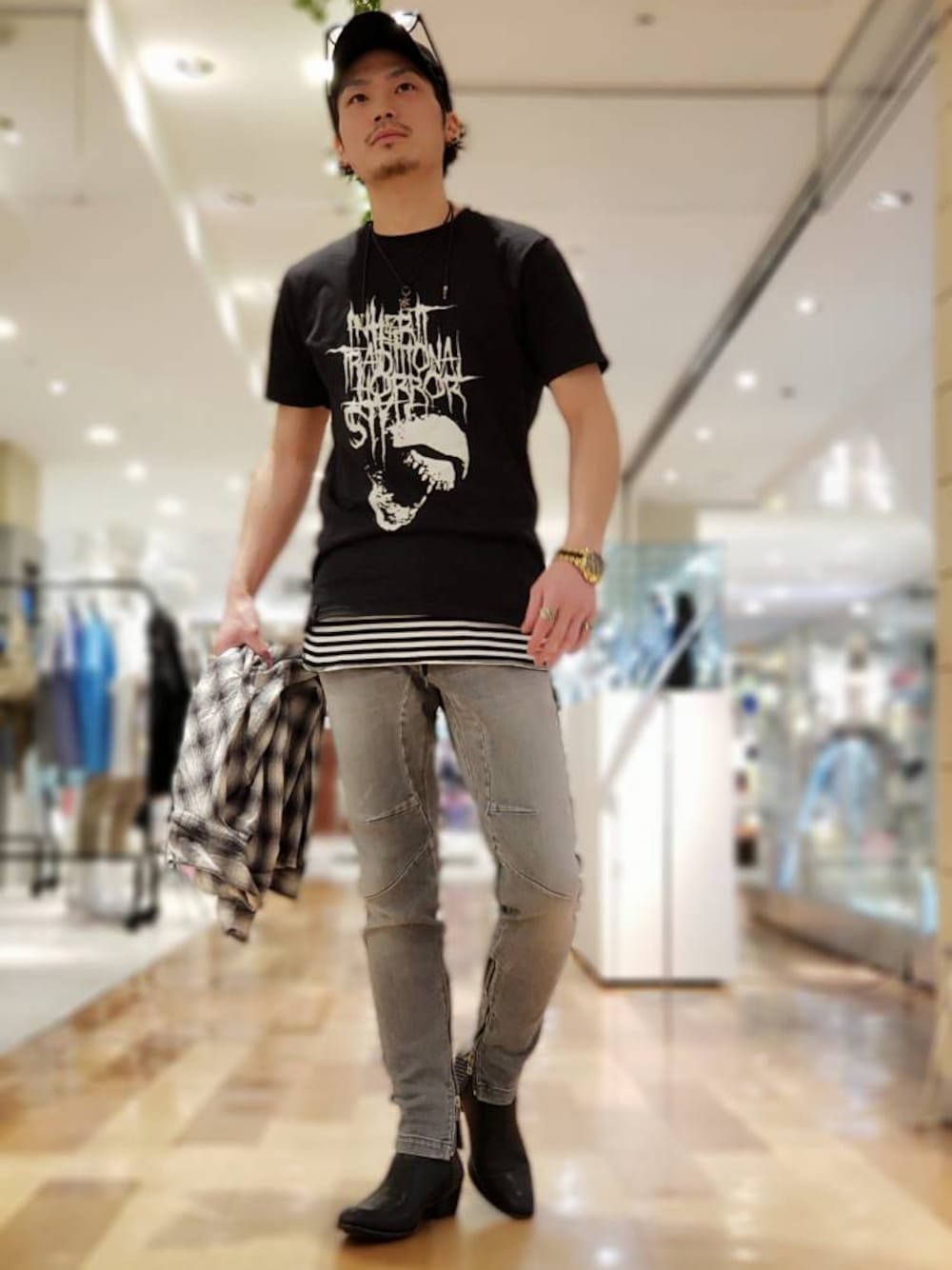 5351らしいロックテイストなコーディネート。 カットソー・・・02360021033 ¥8,500+税 インナー・・・02360021104 ¥12,000+税 パンツ・・・02360050034 ¥40,000+税 シューズ・・・02350062018 ¥39,000+税 ジョガーパンツにロックTを合わせ5351らしいロックスタイルの完成です。 丈長のタンクとインナーに合わせ、シャツは腰巻しても◎