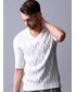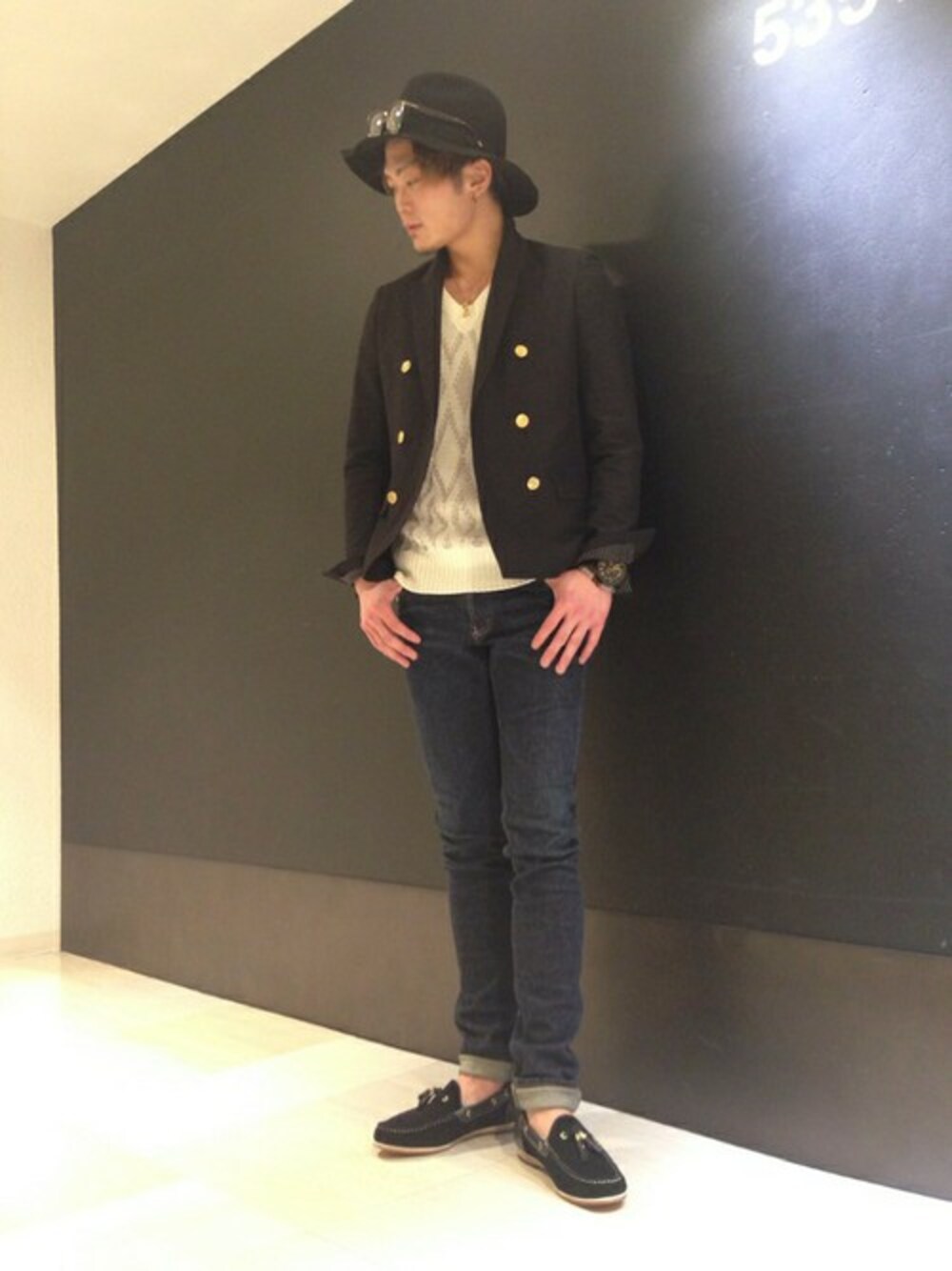 びしゅう地方で別注したオリジナルテキスタイル。 通常よりもさらに強く撚った糸「強撚糸」を使った織物です。 布面に「しぼ」を立て、しわになりにくく、さらっとした肌触りが特長で、夏物に最適な素材です。 コットンとリネンを使い夏らしいドライタッチ感を表現しながらチェック柄にしたダブルジャケット。 夏場でも涼しく、羽織ジャケットとしてお使い頂けます。 インナーにはダイヤ柄の半袖ニットで、柄on柄スタイル。 ジャケット自体はうっすらとしたチェック柄なので、こういったスタイリングもしやすいです。 パンツはシンプルな定番デニムで。 足元はタッセルローフォーで綺麗めスタイルを格上げ。