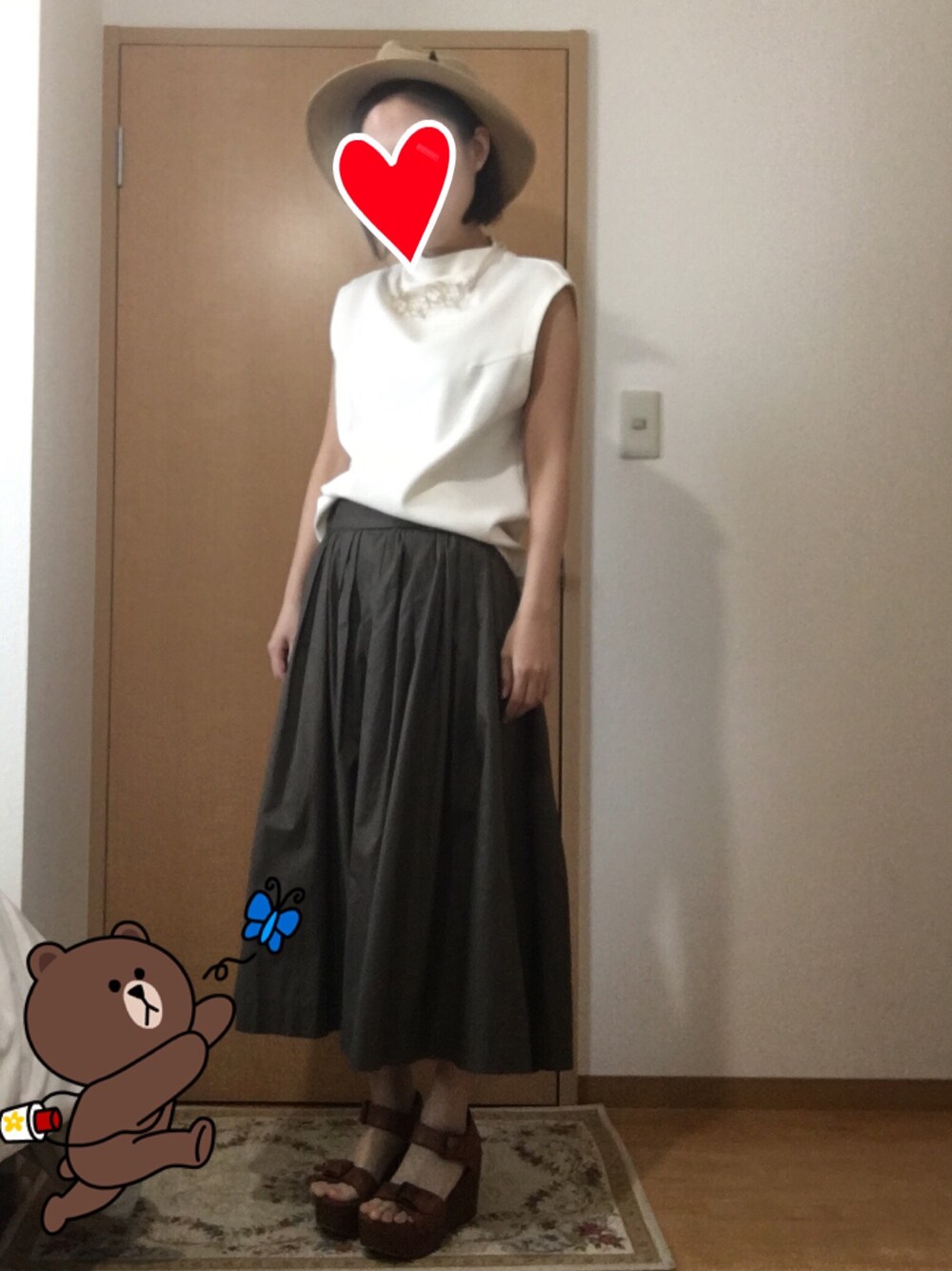 これまた一気に夏っぽく。 カシラの麦わら帽子は被るとこなれ感が出ます。 カスタネのサンダルは4、5年前のものですが、 今も気に入って履いてます😊 スカートはカーキです。