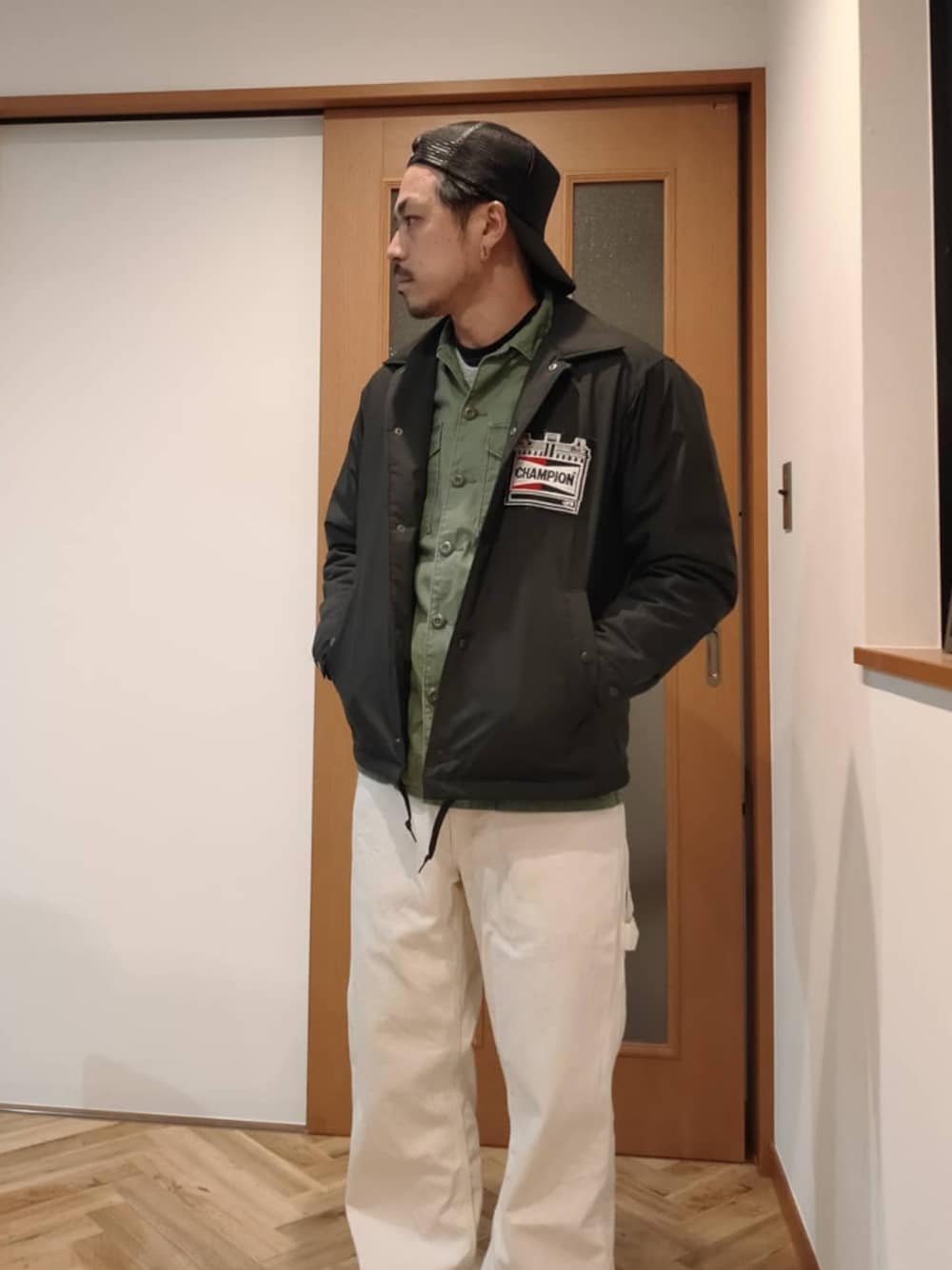 チープコーデです コーチジャケットは CHAMPIONの ヴィンテージワッペンで カスタム