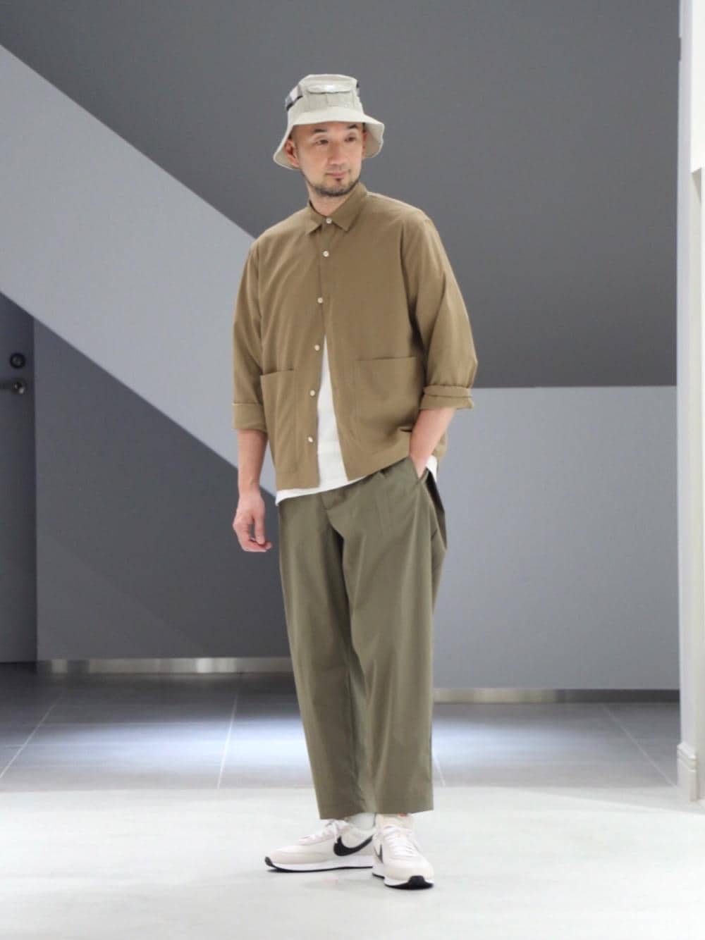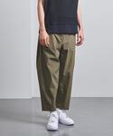 地味になりそうなトップスとパンツの色合いに、白を効かせてメリハリをつけました。<EN ROUTE(アンルート)>のパンツはサイドにプリーツをとった面白いデザインなので、腰回りを見せられるように着丈の短めなトップスにしています。