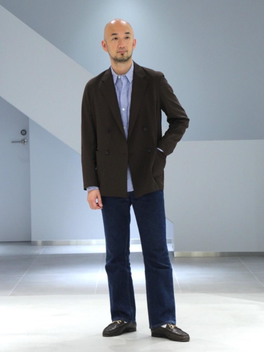 年齢40代後半 身長174cm 普段サイズ 【サイズ感】 ジャケット:標準的 【素材感】 ジャケット:化繊ながらウール見えする素材 【コーディネートポイント】 4つボタンのダブルブレストながら、ノッチドラペルやパッチポケットのデザインで、クラシックにみえず、カジュアルなスタイルに取り入れやすいジャケットです。ブルーとブラウンはとても相性が良いので、色数を抑えて極力シンプルにコーディネートしました。