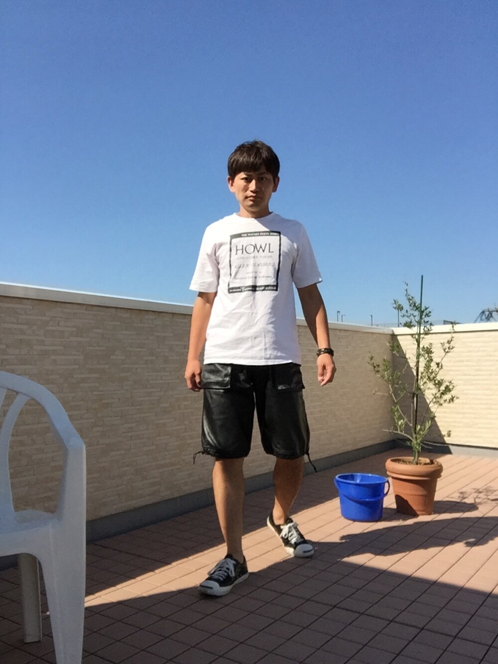 モノトーンでレザーのショートパンツにモノトーンのTシャツでシンプルに。