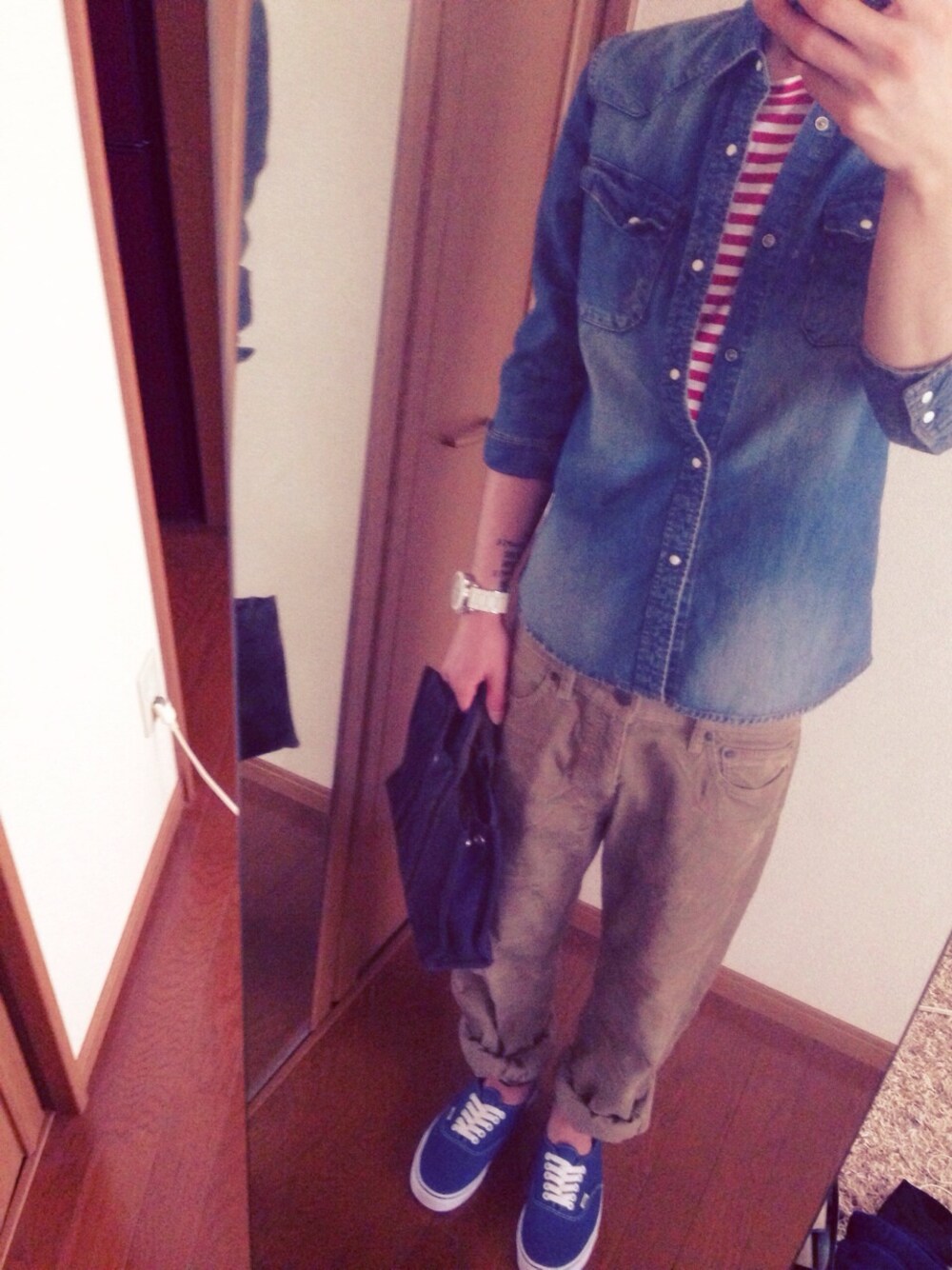 貰い物コーデ! おとんに貰ったパンツ。笑 ブランド不明のサイズBIG!!! くしゃくしゃに巻き上げると 意外にイケる⁉︎と内心ハマるわし… 姉さんに貰ったカバン。 フールトゥ、エールラインは昔流行った 物やけど、使いがってがちょうどイイ!