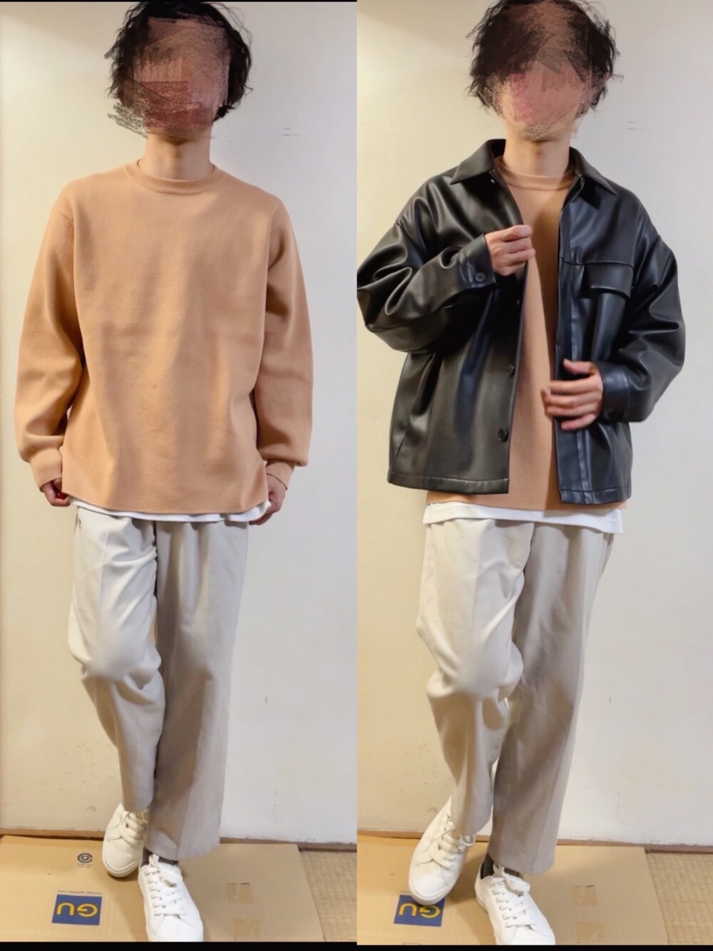 2021年2月4日 今日のコーデ! 白のパンツに淡いくすみカラーのトップスが相性抜群! 黒のレザーでちょっと全体を引き締めました!