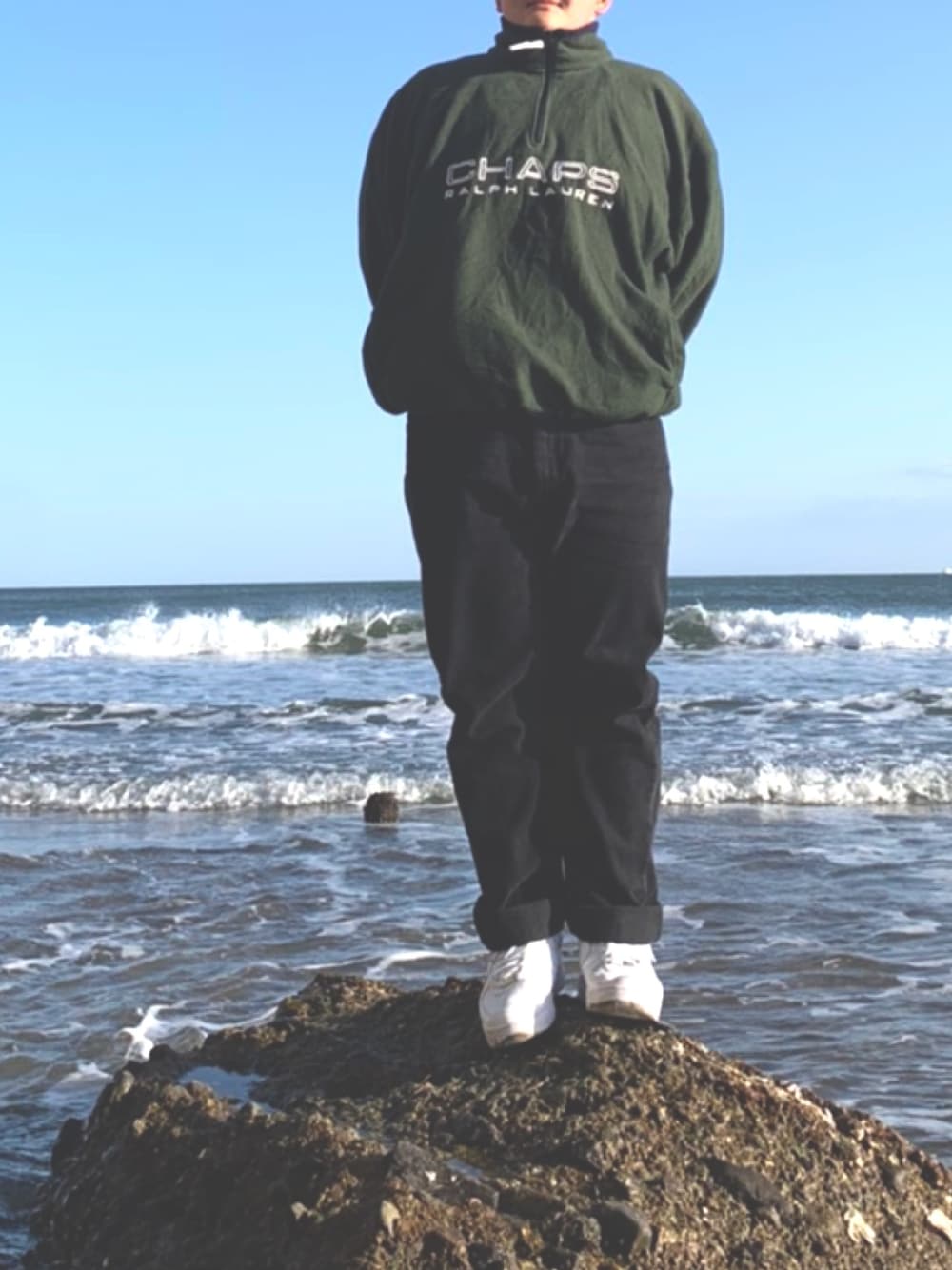 海をバックに! ズボンはリーバイス!古着! トップスはラルフの古着です!! 最近古着巡りハマってます!