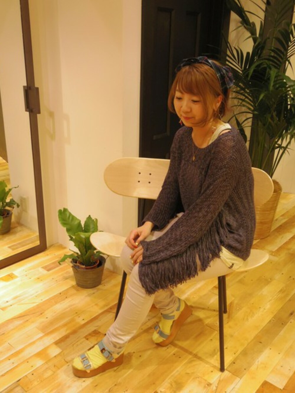 そでにフリンジをつけたニットをタイトなパンツとコーディネートしてみました。 グレーなのでカラーパンツとの相性もよく、女の子らしいスタイルが作れます。