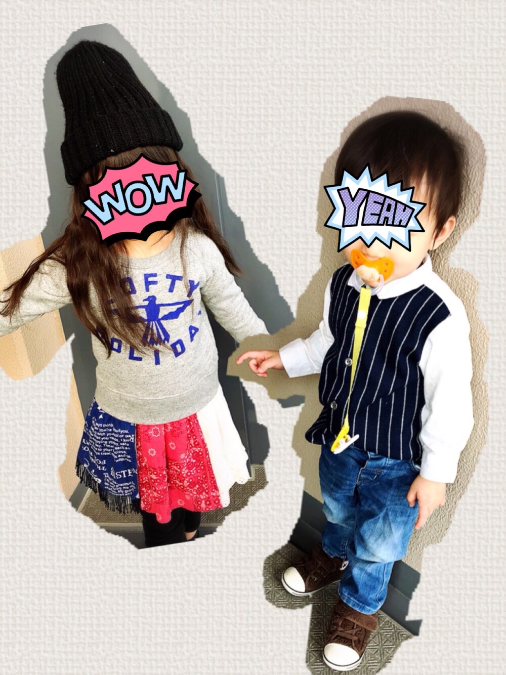 今日のワンポイントは おしゃぶりです(^∀^) 中々、取れないおしゃぶり 困ってます。 もうファッションのワンポイントにするしかない…。 お姉ちゃんは ワンピースなので コーデする暇がないときに とっても重宝してる1枚です。