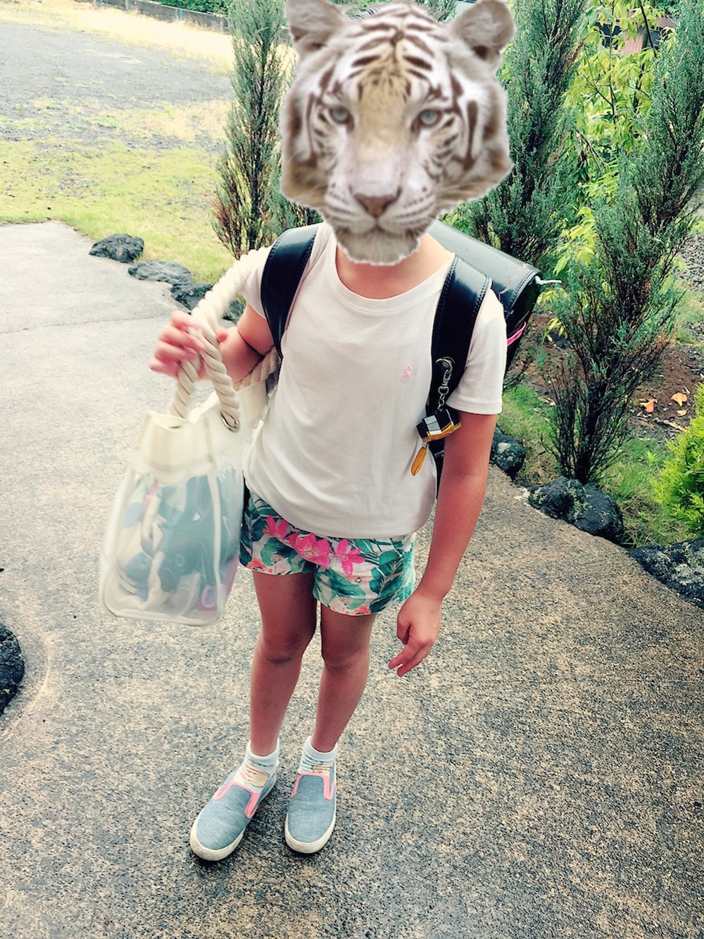 ボタニカル柄のショートパンツに合わせて今日はホワイトタイガーな娘。 今朝は浮腫んでいる為かこのタイガーみたいにモヤッとした顔してた。 スニーカーは、これもうキツイ!と言われこの後、履き替えた。 学校のプールバッグは4年間使っているジェラピ。