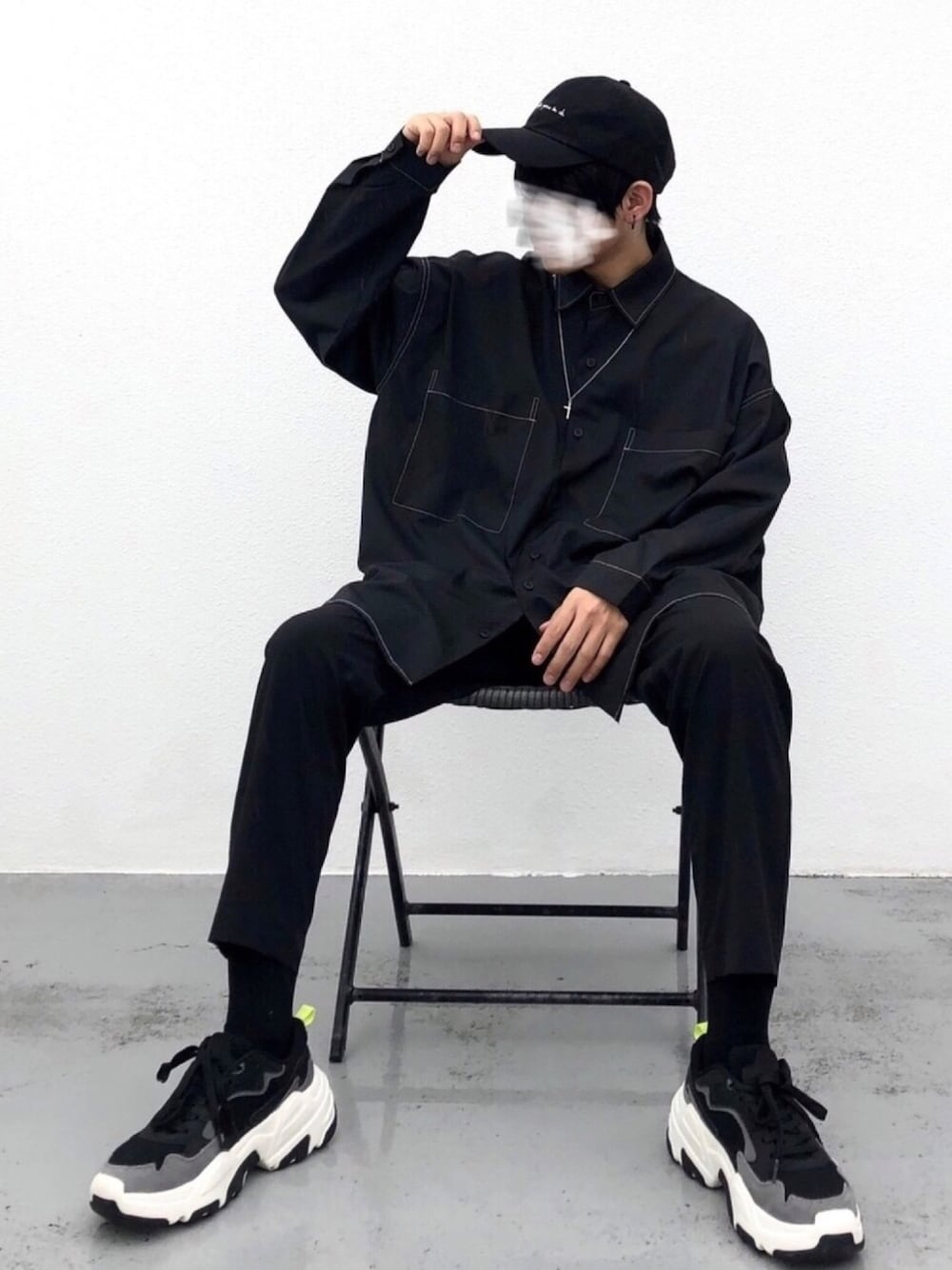 オールブラックでストリートコーデ キャップとダッドスニーカーで ストリートチックに シャツとスラックスで キレイ目とカジュアルの バランスを取ってます 黒地に白ステッチのシャツが 大好きで3種類ほど 持っていますが kutirのシャツはオーバーサイズで 綺麗なVシルエットがつくれるので 気に入ってます シャツとスラックスは ポリエステル100%なので シワになりくく、涼しい素材感で 管理もしやすく、何より安い 非常にコスパのいいアイテムです